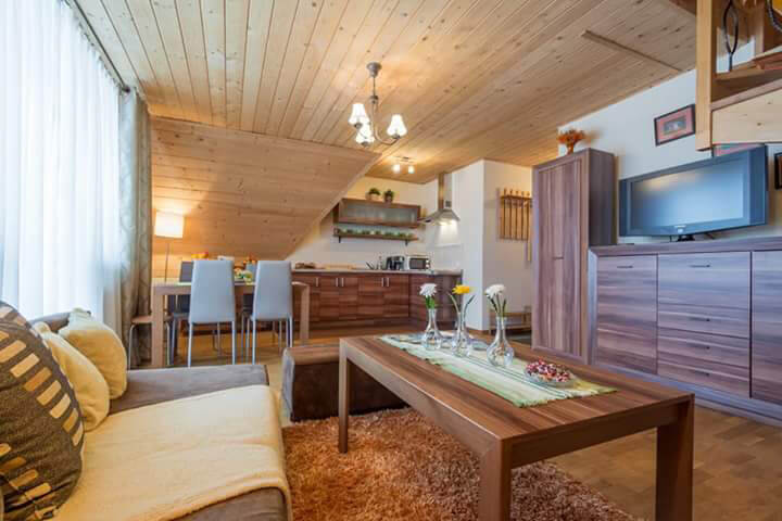Квартира POD-SMERKIEM - Несомненно, это идеальная горная квартира в деревенском стиле в 6 км от Закопане - идеально подходит для родителей с детьми. Деревянные полы и стены, острые наклоны (эффект благотворных и восстанавливающих свойств пирамиды), лестница, соединяющая два очень просторных этажа, и, наконец, прекрасный вид на Западные Татры. Рядом находятся горнолыжные склоны с подъемниками и термальными бассейнами Хохоловские Термы и бассейны на Шимошковой.